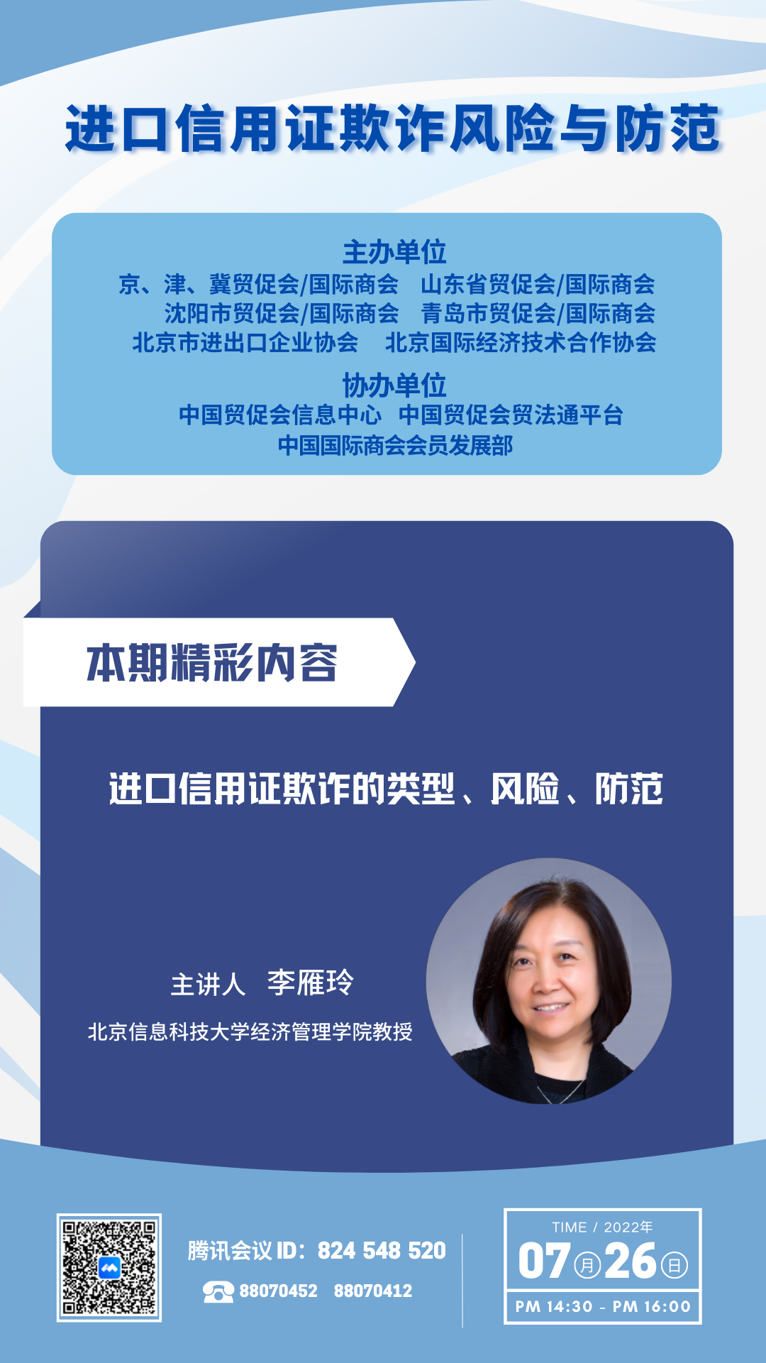 为了帮助外贸企业了解进口信用证欺诈风险,提高进口信用证风控管理意识,提升进口信用证欺诈应对能力,有效维护企业自身权益,京、津、冀三地贸促会、国际商会,山东省贸促会、国际商会,沈阳市贸促会、国际商会,青岛市贸促会、国际商会,济南市贸促会,北京市进出口企业协会、北京国际经济技术合作协会将合作举办“进口信用证欺诈风险与防范”线上培训会。培训会具体安排如下: