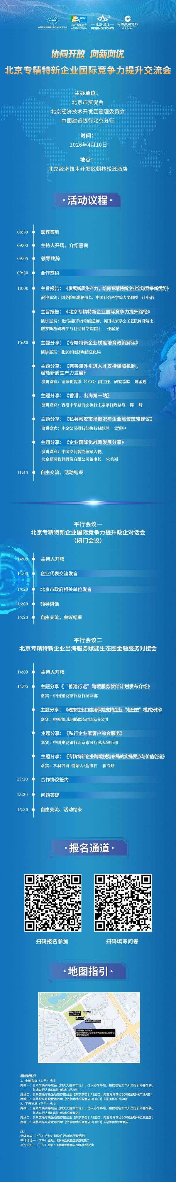 为深化北京专精特新企业国际化发展布局,切实助力企业提升国际竞争力、精准对接全球市场资源,由北京市贸促会、北京经济技术开发区管理委员会、中国建设银行北京市分行共同主办的北京专精特新企业国际竞争力提升交流会,定于2026年4月10日在北京经开区朝林松源酒店(北京经开区荣华中路19号)举行。