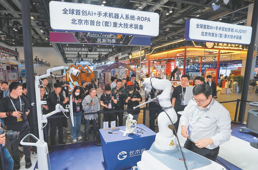 在长木谷医疗展台,全球首创的人工智能+全骨科手术机器人ROPA正在演示“膝关节置换手术”的场景。北京长木谷医疗科技股份有限公司联合创始人刘星宇表示,传统机器人相当于医生的工具,而全骨科手术机器人增加了感知能力,既有“大脑”和“眼睛”,还有灵巧的“手臂”,本身就如同一位经验丰富的骨科医生,可以让骨科手术变得更加精准、高效,缩短手术时间。目前,全骨科手术机器人已在上百家医院进行临床使用。