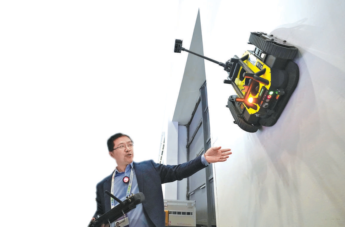 机器人近年来发展势头迅猛。科博会现场,奥克福(北京)机器人科技有限公司展出的多功能AI+爬壁机器人,能轻轻松松爬上展馆的墙壁秀“绝活”。