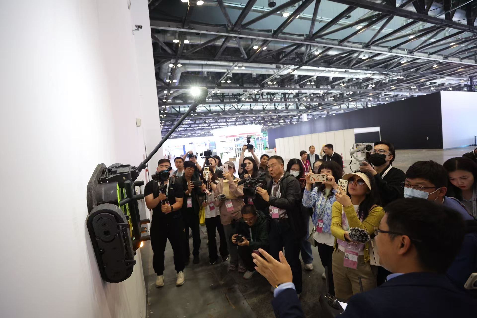 在奥克福(北京)机器人科技有限公司的展台上,一款多功能AI+爬壁机器人引起了大家的注意。它的外形像一台低小型的坦克,拖着一个长杆,底部是吸盘和履带,靠着真空吸附它轻松爬上了展馆的墙壁,在上面来回“巡视”。“它的底部是一个密封圈,风机往外抽真空,让它底部形成一个负压区,所以可以适应任何环境。”该公司CEO柴建伟介绍,不仅是平整的墙壁,凹凸不平的地面也完全不在话下。现在,这款机器人已经在北京地铁隧道等场景测试,此外,它还适应很多特殊场景,比如核电设施、飞机制造、水利大坝等场景。
