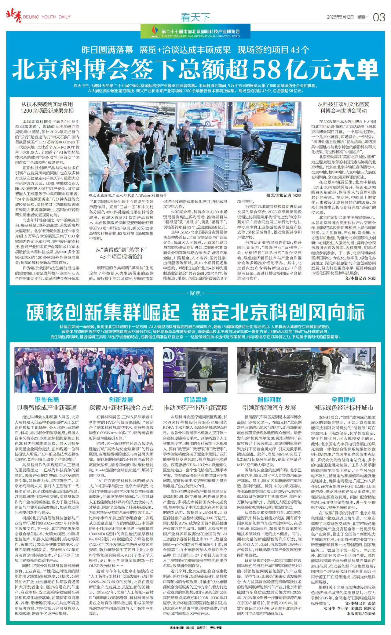 昨天下午,为期4天的第二十七届中国北京国际科技产业博览会圆满落幕。本届科博会期间,5万平方米的展览云集了800余家国内外企业和机构,六大展区集中展出前沿科技、新兴产业和未来产业等领域1200余项最新技术和科技成果。现场签约项目43个,总金额超58亿元。