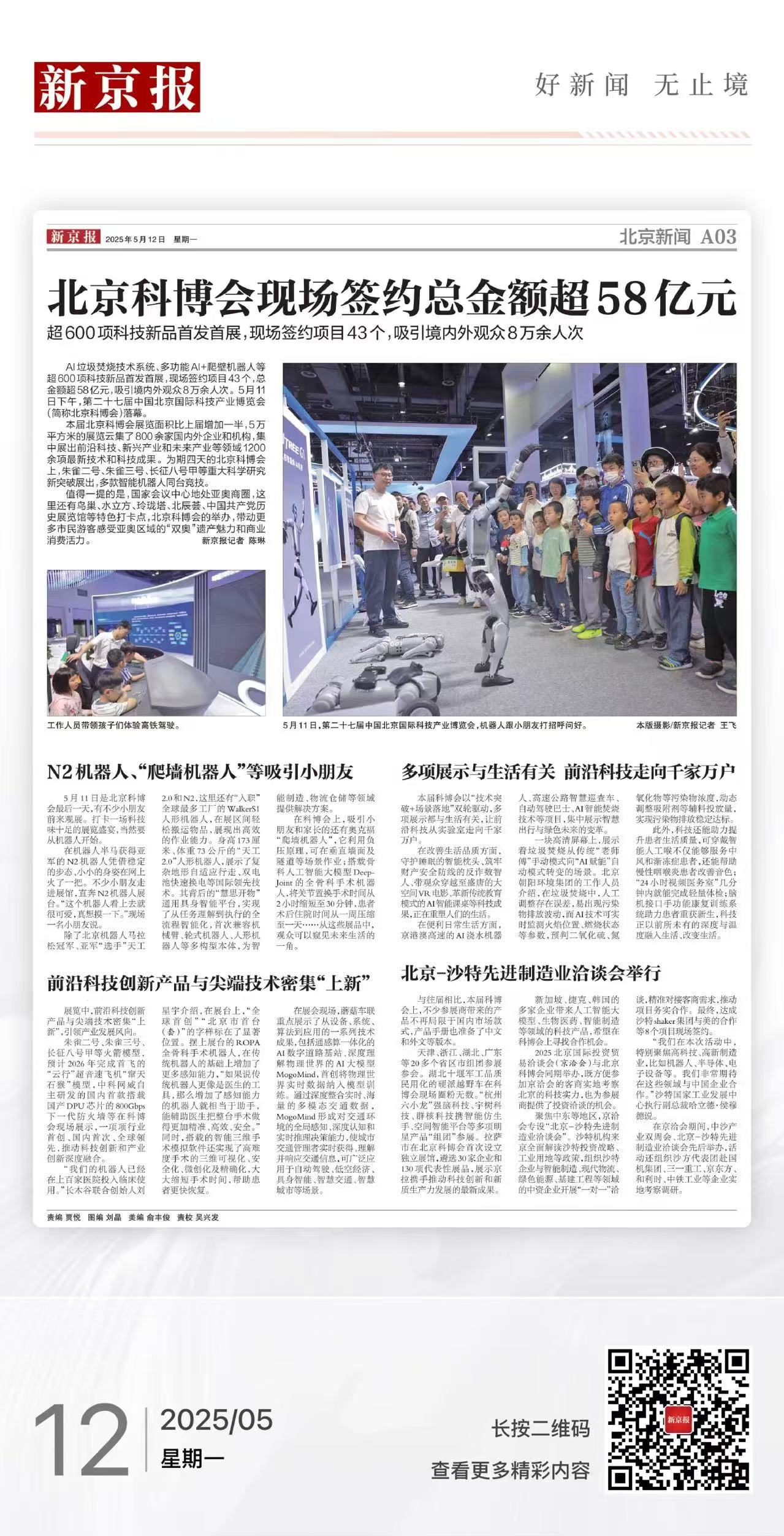 AI垃圾焚烧技术系统、多功能AI+爬壁机器人等超600项科技新品首发首展,现场签约项目43个,总金额超58亿元,吸引境内外观众8万余人次。5月11日下午,第二十七届中国北京国际科技产业博览会(简称北京科博会)落幕。